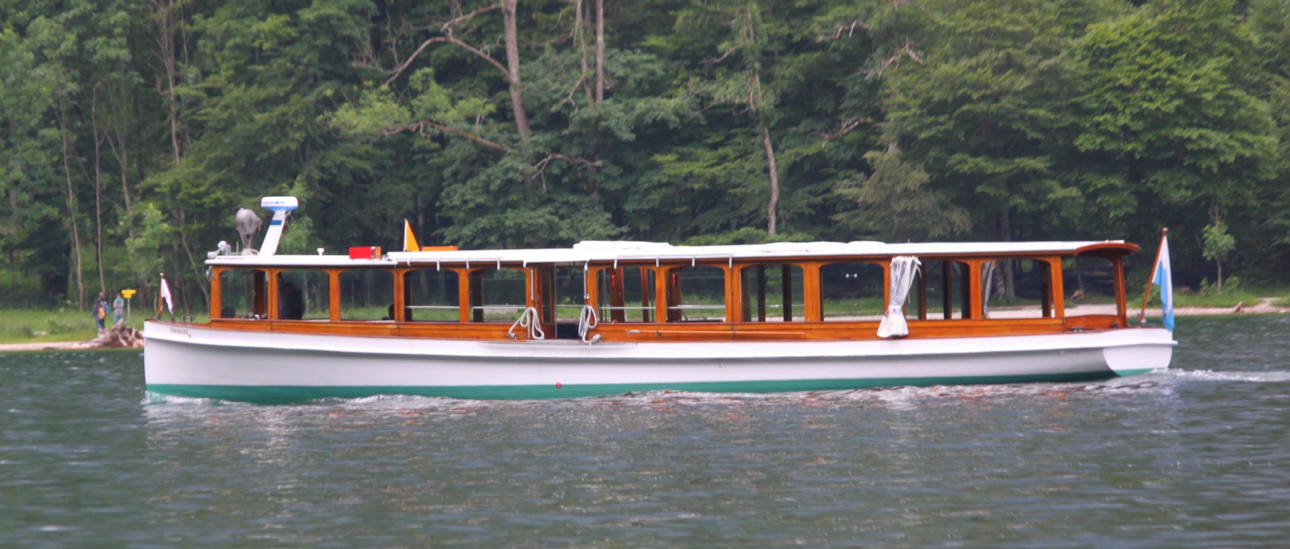 Das kleinste Boot der Königssee-Flotte, das EMB “Ramsau”, vor der Wallfahrtskirche St. Bartholomä – Foto: Jörg Blobelt, CC BY-SA 4.0 <https://creativecommons.org/licenses/by-sa/4.0>, via Wikimedia Commons