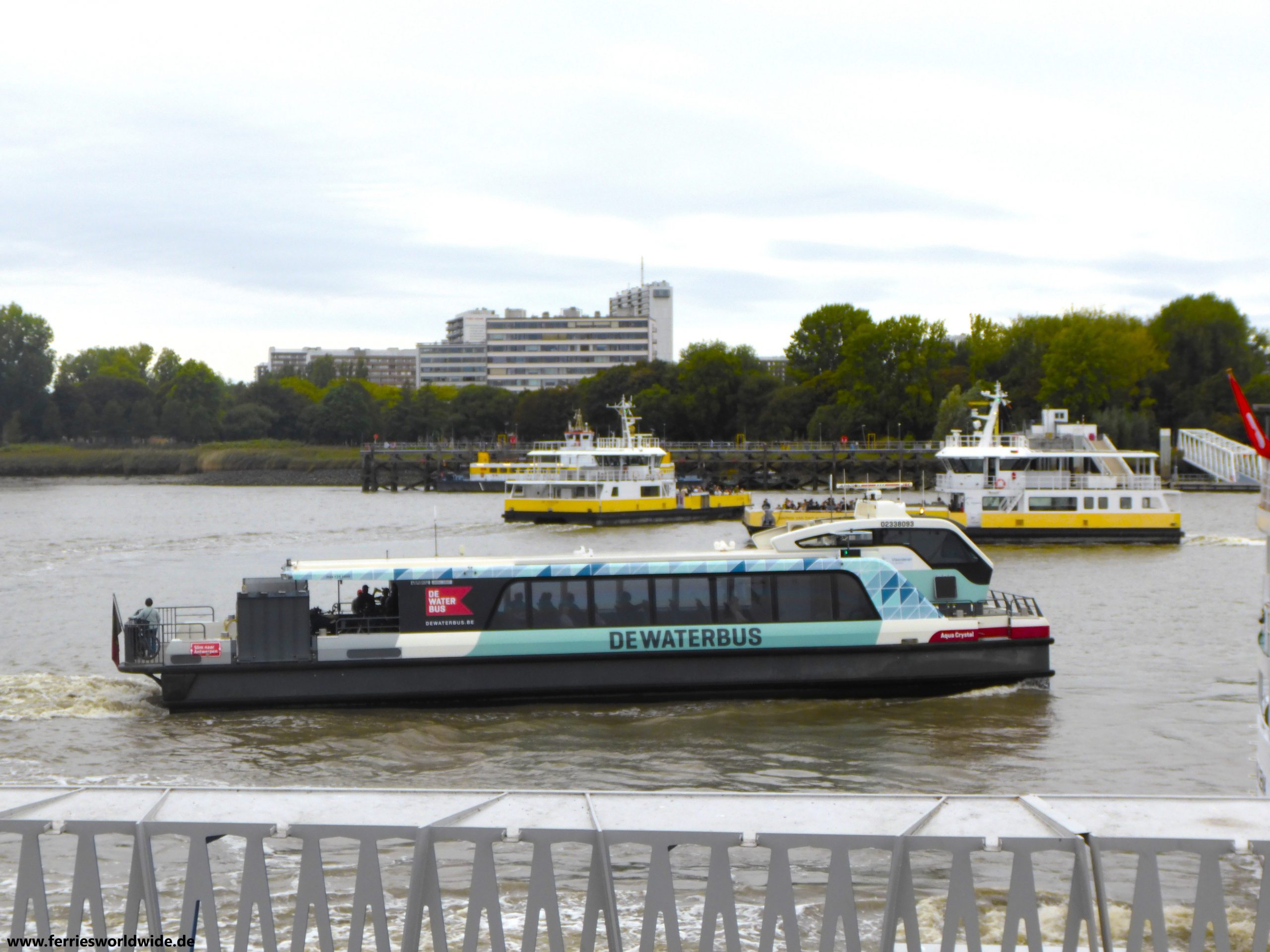 Heavy traffic auf der Schelde! Blick vom Anleger “Steenplein” auf das linke Scheldeufer mit dem Waterbus “Aqua Crystal” und den Fähren “Op Stroom” und “Marnix van Sint Aldegonde”. Am linken Ufer liegt die Vorgängerfähre “Schelde” auf – Foto: Ulrich Repp, www.ferriesworldwide.de