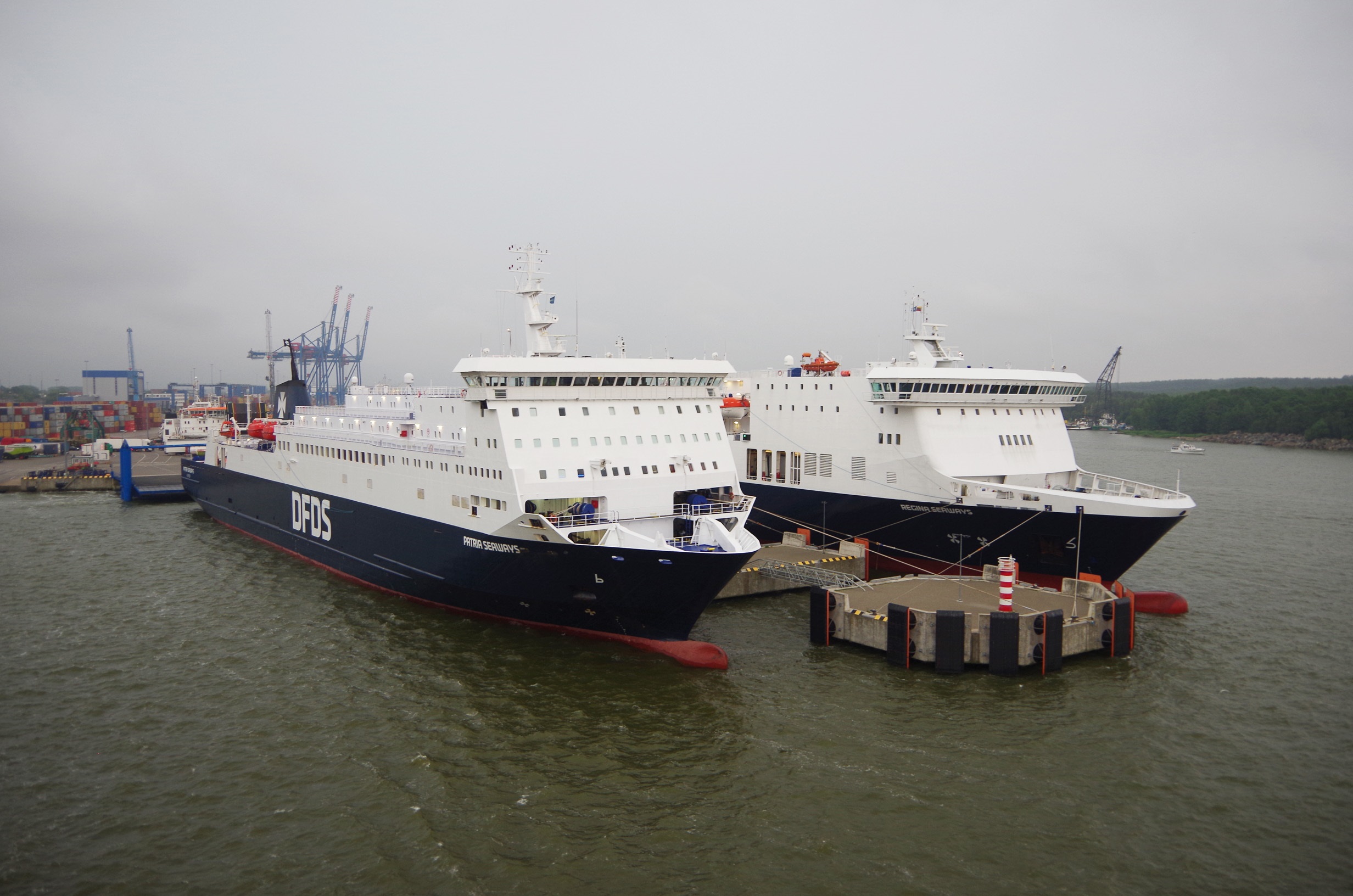 Der DFDS-Fähranleger in Klaipeda 2019 mit den beiden Fähren Patria Seaways (IMO 8917390) and Regina Seaways (IMO 9458535) – Foto: MakVik via flickr, CC BY-NC 2.0 Attribution-NonCommercial 2.0 Generic