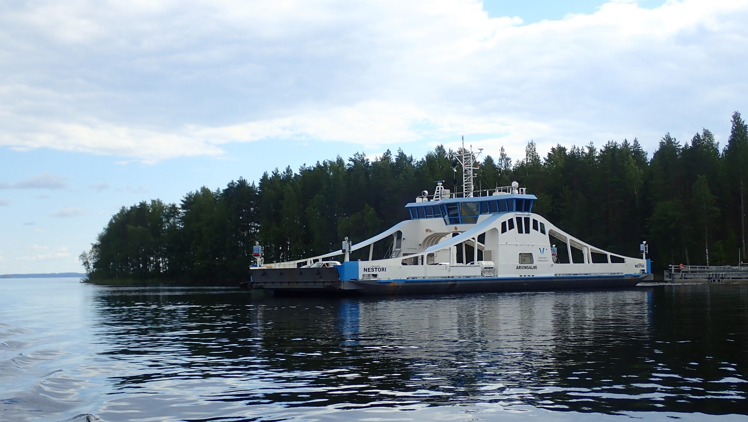 ) ist zusammen mit ihrem Schwesterschiff “Vikari” die größte Binnenfähre in Finnland. Sie wurde 2013 unter der Baunummer 210204 auf der Werft Uudenkaupungin Työvene Oy in Uusikaupunki gebaut und im Teknola Dock in Savonlinna endmontiert. Von Anfang 2013 bis Juni 2020 verkehrte sie an der Fährstelle Kietävälä, seit 1. August 2020 an der Fährstelle Arvinsalmi. Die Fähre ist 47,4 Meter lang, 12,9 Meter breit und hat einen Leertiefgang von 1,80 Meter. Der Tiefgang in abgeladenem Zustand liegt bei 2,50 Meter. Der Rumpf ist aus Stahl, das Ruderhaus aus Aluminium gefertigt. Die Transportkapazität beträgt 24 PKW, die Tragfähigkeit 150 Tonnen. Die “Nestori” ist für 215 Fahrgäste zugelassen. Sie wird von drei Dieselmotoren mit jeweils 450 PS Leistung angetrieben, die eine Höchstgeschwindigkeit von 9 Knoten ermöglichen. Foto: Arkopone, CC BY-SA 4.0 <https://creativecommons.org/licenses/by-sa/4.0>, via Wikimedia Commons