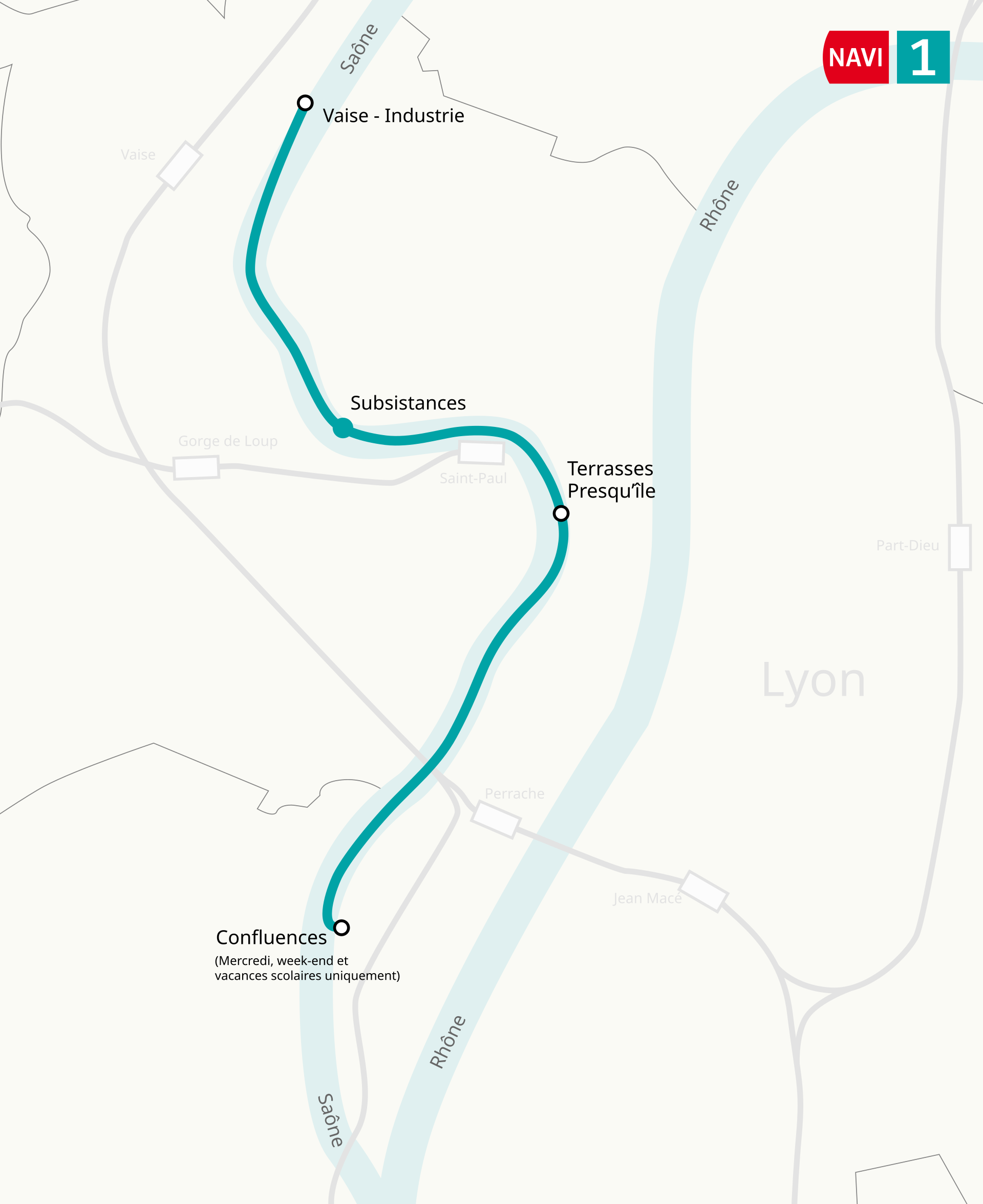 TCL, die Gemeinsame Verkehrsbehörde für die Rhône und die Metropolregion Lyon, eine für den öffentlichen Nahverkehr zuständige Stelle in der französischen Stadt Lyon, betreibt eine Fährlinie auf der Strecke zwischen den Lyoner Bezirken Vaise-Industrie und Confluence. TCL wird von SYTRAL Mobilités verwaltet, die Richtlinien festlegen und die Infrastruktur finanzieren. Dieser Fährdienst ist nicht nur für Pendler gedacht, sondern soll die Attraktivität der Stadt für Touristen erhöhen. Die Fährlinie NAVI1 (auch bekannt als Navigône) wurde am 18. Juni 2025 Teil in Betrieb genommen und verkehrt ganzjährig. Sie verbindet das Viertel Vaise im Norden mit dem modernen Viertel Confluence im Süden über die Saône.