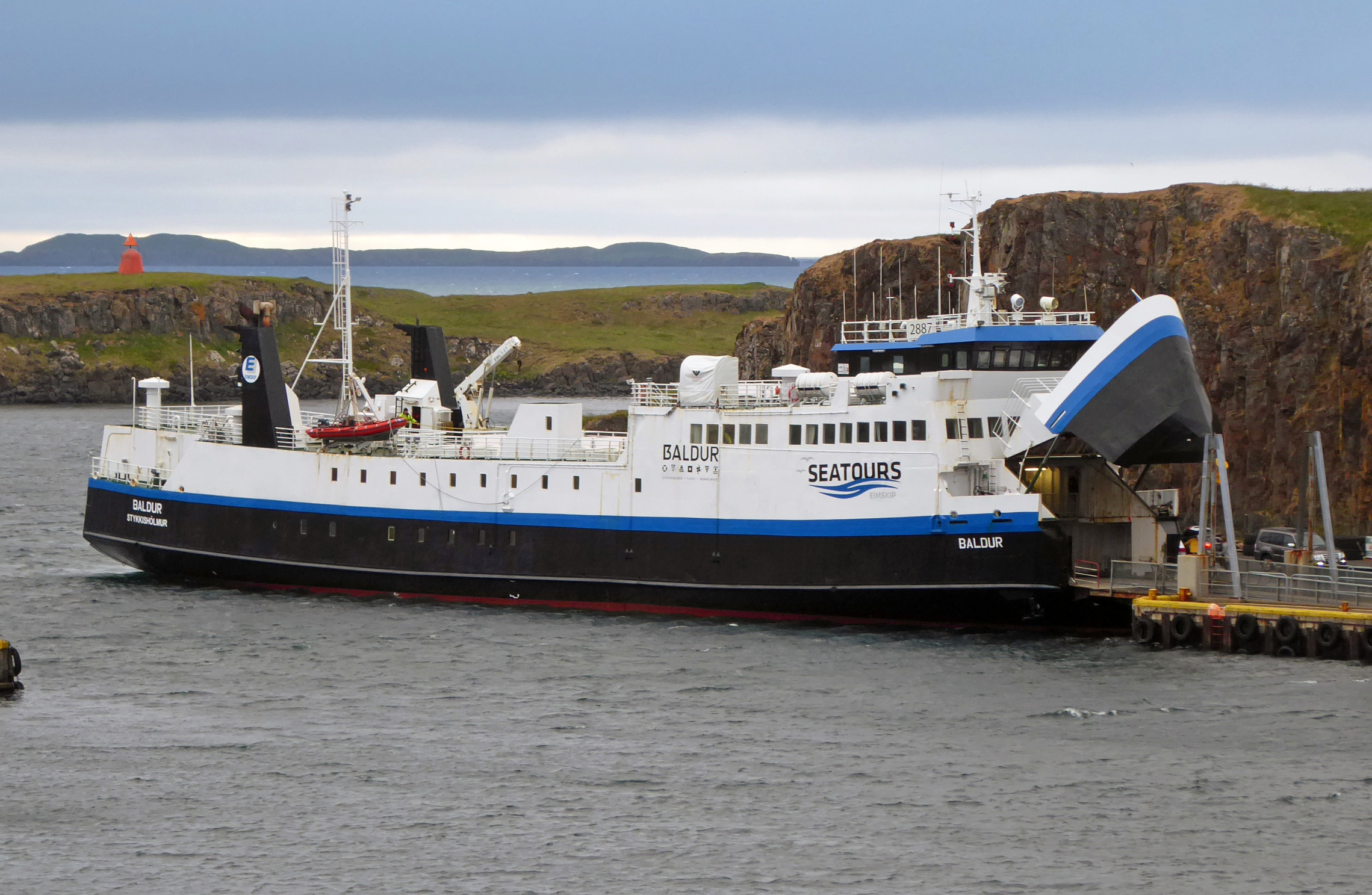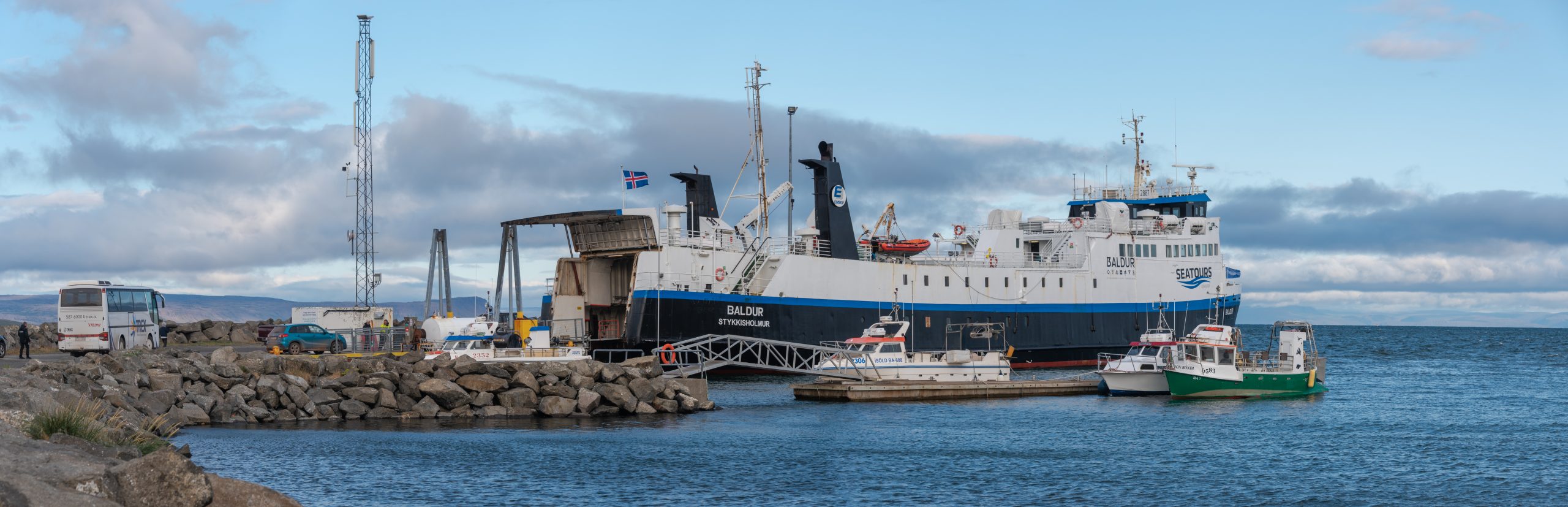 Die Fähre Baldur überquert täglich die Bucht Breidafjörður zwischen Stykkishólmur auf der Halbinsel Snæfellsnes und Brjánslækur im Norden Islands. Eine Fährfahrt verkürzt die Strecke zwischen dem Süden und Mittleren Westen des Landes und der Region Westfjorde. Während der Sommermonate gibt es täglich zwei Abfahrten; siehe Sommerfahrplan. Im Sommer besuchen viele Besucher die wunderschöne, bezaubernde Insel Flatey, die für ihre Vogelwelt bekannt ist. Es ist beliebt, morgens die Fähre von Stykkishólmur zu nehmen und abends zurückzukehren oder weiter nach Brjánslækur zu fahren. Für diejenigen, die mit dem Auto anreisen, besteht die Möglichkeit, das Auto über die Bucht zu schicken und in Flatey anzuhalten (ohne Aufpreis).