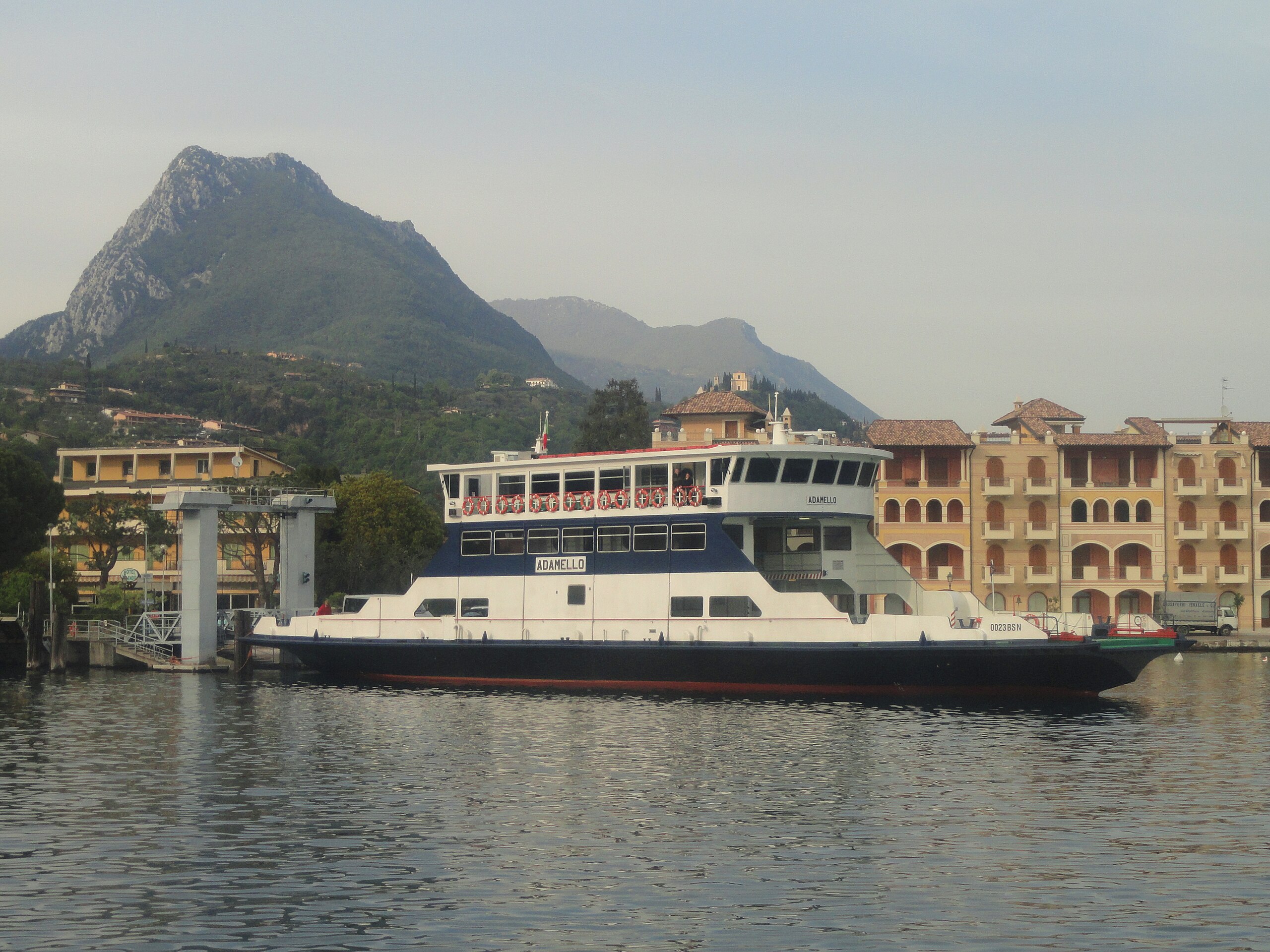 Die Fähre “Adamello” wurde 1992 auf der Werft Peschiera della Navigazione am Gardasee gebaut. Sie ist 41,6 Meter lang, 9,40 Meter breit und hat ein Eigengewicht von 570 Tonnen. Sie kann 100 PKW befördern und ist für 301 Passagiere zugelassen. Die Motorisierung erfolgt durch zwei IVECO Dieselmotoren Typ AIFO 8291 mit jeweils 515 kW Leistung, die zwei Schottel-Propeller antreiben. Die Höchstgeschwindigkeit beträgt 26 km/h. Foto: Daderot, Public domain, via Wikimedia Commons