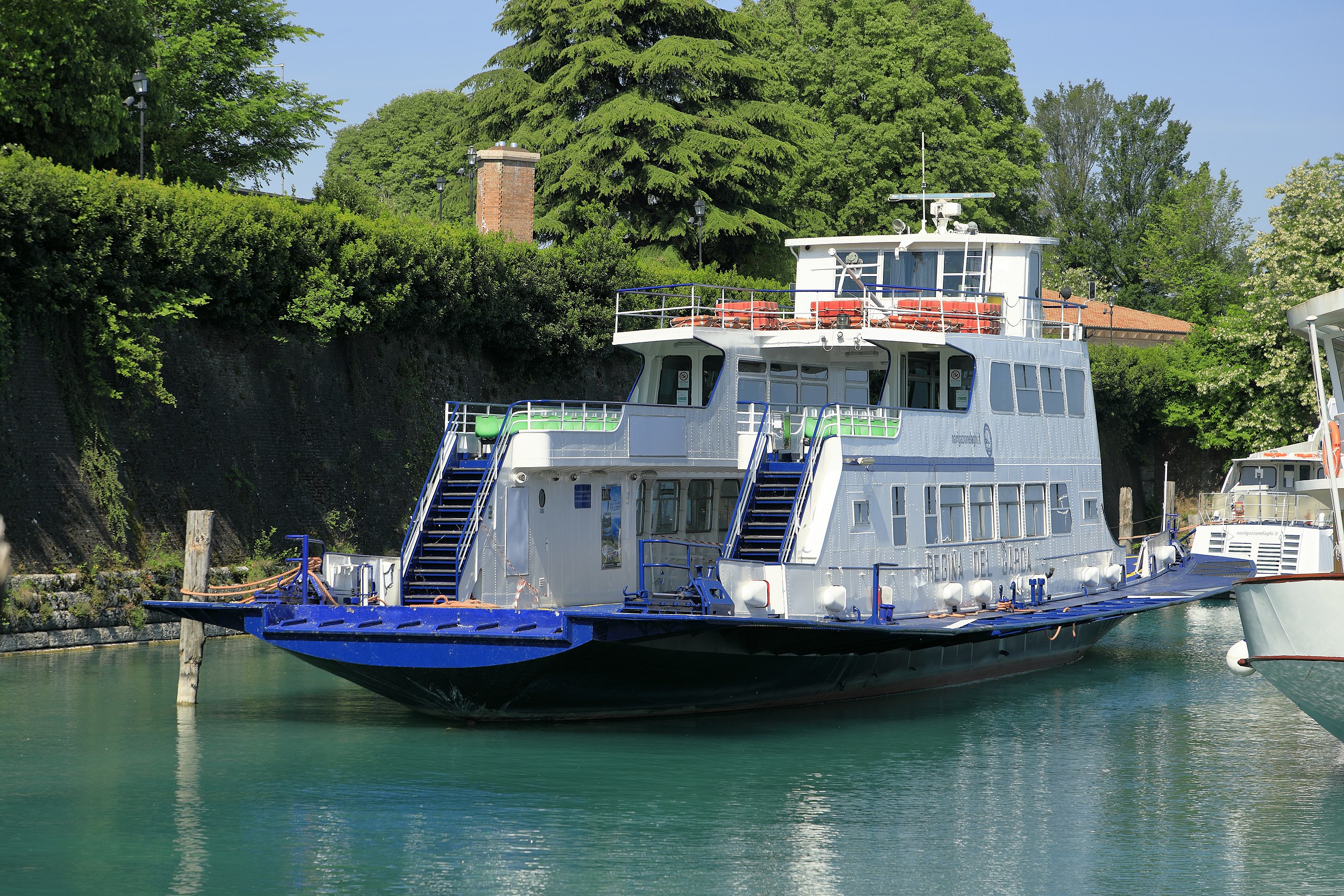 Die Doppelendfähre “Regina del Garda” wurde 1964 auf der Werft Cantieri Navali Breda di Venezia gebaut. Sie war die erste echte Fähre, die eine nennenswerte Anzahl von Autos befördern konnte, um einen Liniendienst auf dem Gardasee durchzuführen. Dieses Schiff wird immer noch im Liniendienst eingesetzt, insbesondere im Winter. Die “Regina del Garda” ist 39,5 Meter lang, 6,7 Meter breit und hat eine Verdrängung von 226 Tonnen. Sie kann 41 PKW befördern und ist für 185 Passagiere zugelassen, denen 92 Sitzplätze zur Verfügung stehen. Die Maschinenanlage leistet 442 kW (ca. 600 PS) und ermöglicht eine Höchstgeschwindigkeit von 22 km/h.Foto: Falk2, CC BY-SA 4.0 <https://creativecommons.org/licenses/by-sa/4.0>, via Wikimedia Commons