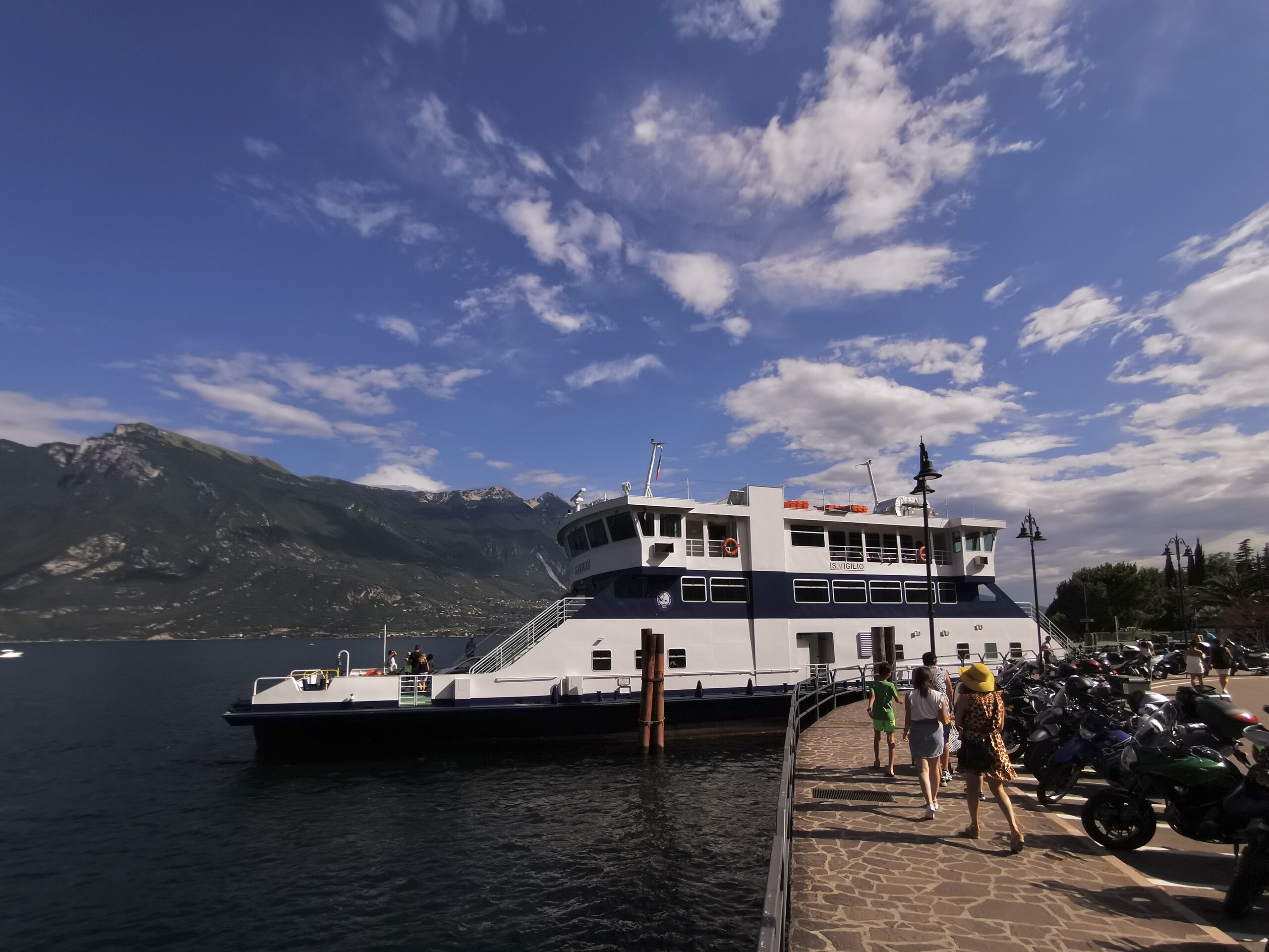 Das Fährschiff „San Vigilio“ wurde 2005 auf der Werft Peschiera della Navigazione am Gardasee gebaut. Sie ist 46,3 Meter lang, 9,6 Meter breit und hat eine Verdrängung von 516,3 Tonnen. Sie kann 100 PKW befördern und ist für 295 Fahrgäste zugelassen. Zwei MTU-Dieselmotoren Typ 2000 M60 mit 12 Zylindern und jeweils 548 kW Leistung ermöglichen eine Höchstgeschwindigkeit von 25 km/h. Foto: Mateus2019, CC BY-SA 3.0 <https://creativecommons.org/licenses/by-sa/3.0>, via Wikimedia Commons