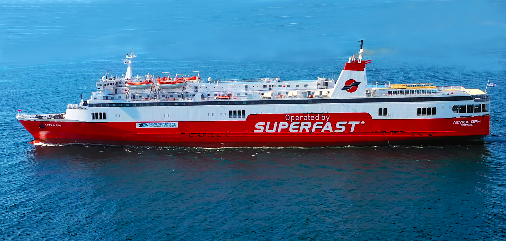 ) lief am 31. März 1987 unter der Baunummer 899 auf der Werft von Mitsubishi Heavy Industries im japansichen Shimonoseki vom Stapel. Die Ablieferung an die Reederei Higashi Nihon Ferry Company & Eiyu Shoji Y.K. erfolgte am 20. Juli 1987, die das Schiff als “Varuna” auf der Verbindung zwischen Ōarai und Muroran in Dienst stellte. Nach elf Dienstjahren in Japan ging das Schiff im September 1998 als “Superferry Hellas” an die griechische Strintzis Line, für die es nach Umbauarbeiten ab Januar 1999 auf der Strecke zwischen Patras, Igoumenitsa und Korfu nach Venedig bzw. Ancona im Einsatz stand. Im Jahr 2000 ging die Fähre als “Blue Horizon” an die neugegründete Tochtergesellschaft Blue Star Ferries und verkehrte auf derselben Strecke. In den Wintermonaten wurde sie gelegentlich zwischen Piräus und Heraklion eingesetzt. Nachdem das Schiff ab September 2023 zunächst nicht mehr eingesetzt worden war, wurde es im Dezember 2023 an die Reederei ANEK übergeben und erhielt deren Farbgebung sowie den Namen “Lefka Ori”. Im Frühjahr 2024 übernahm die Reederei SUPERFAST, die mit ANEK eine Kooperation unterhält, die “Lefka Ori”. Mit einem nochmals neuen Anstrich in den Farben von SUPERFAST verkehrt die Fähre zwischen Patras und Ancona beziehungsweise Venedig.