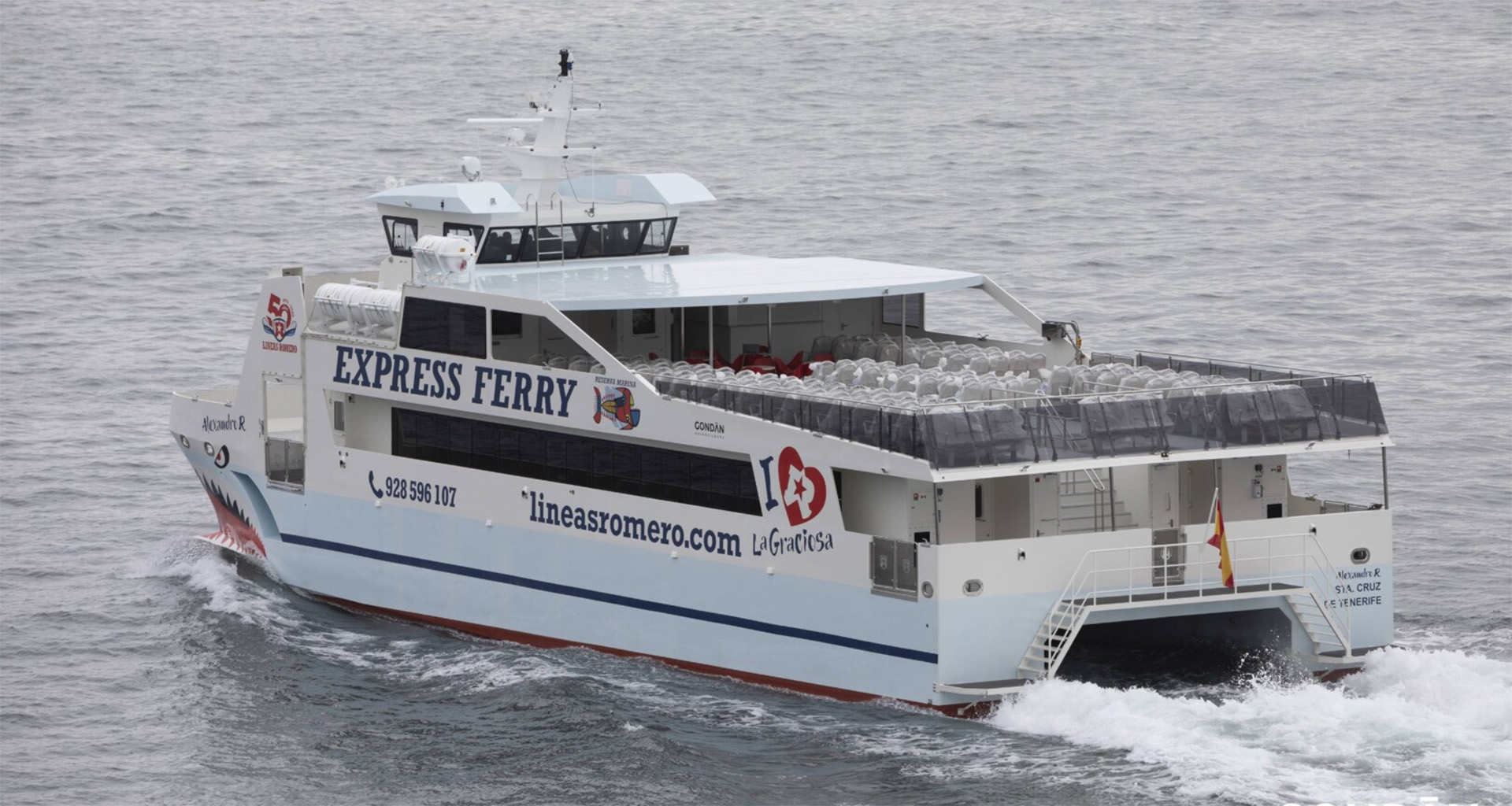 ) wurde 2020 auf der Werft Astilleros Gondan Shipbuilders aus glasfaserverstärktem Kunststoff (GFK) gebaut. Das Schiff ist 30,95 Meter lang, 10,5 Meter breit, hat eine Seitenhöhe zum Hauptdeck von 3,57 Meter und einen Tiefgang von 1,65 Meter. Es ist für 364 Passagiere zugelassen, denn 168 Sitzplätze auf dem Hauptdeck und 196 Sitzplätze auf dem Oberdeck zur Verfügung stehen. Die “Alexandro R” ist mit einer Snack-Bar, die Snacks und Getränke (warm und kalt) anbietet sowie einem kleinen Souvenir-Shop ausgestattet. Die Maschinenanlage besteht aus zwei MAN Dieselmotoren mit jeweils 1.400 PS Leistung bei 2.100 U/min., die auf zwei Festpropeller wirken. Das Schiff erreicht eine maximale Geschwindigkeit von 17 Knoten (ca. 31,5 km/h), die normale Dienstgeschwindigkeit liegt bei 14 Knoten (ca. 26 km/h). Bei Reisegeschwindigkeit kann die ALEXANDRO R etwa 650 Seemeilen zurücklegen, bevor sie nachgetankt werden muss. Foto: Gondan Shipbuilders, Pressemitteilung vom 15. Oktober 2020