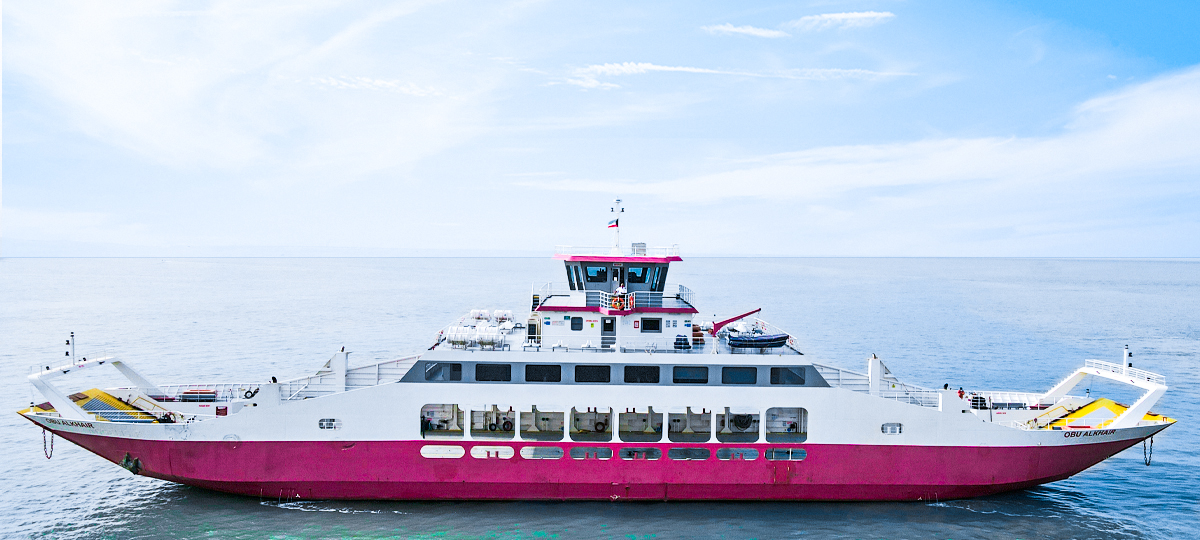 Die “Obu Alkhair” ist 73,45 Meter lang, 15,7 Meter breit und hat einen Tiefgang von 2,3 Metern. Sie ist mit 971 BRZ vermessen und hat eine Transportkapazität von 90 PKW. Die Fähre ist für 350 Passagiere zugelassen. Die Maschinenanlage besteht aus zwei Caterpillar Dieselmotoren mit einer Leistung von jeweils 960 PS, die eine Höchstgeschwindigkeit von 12 Knoten ermöglichen. Foto: Ikarus United Marine Service