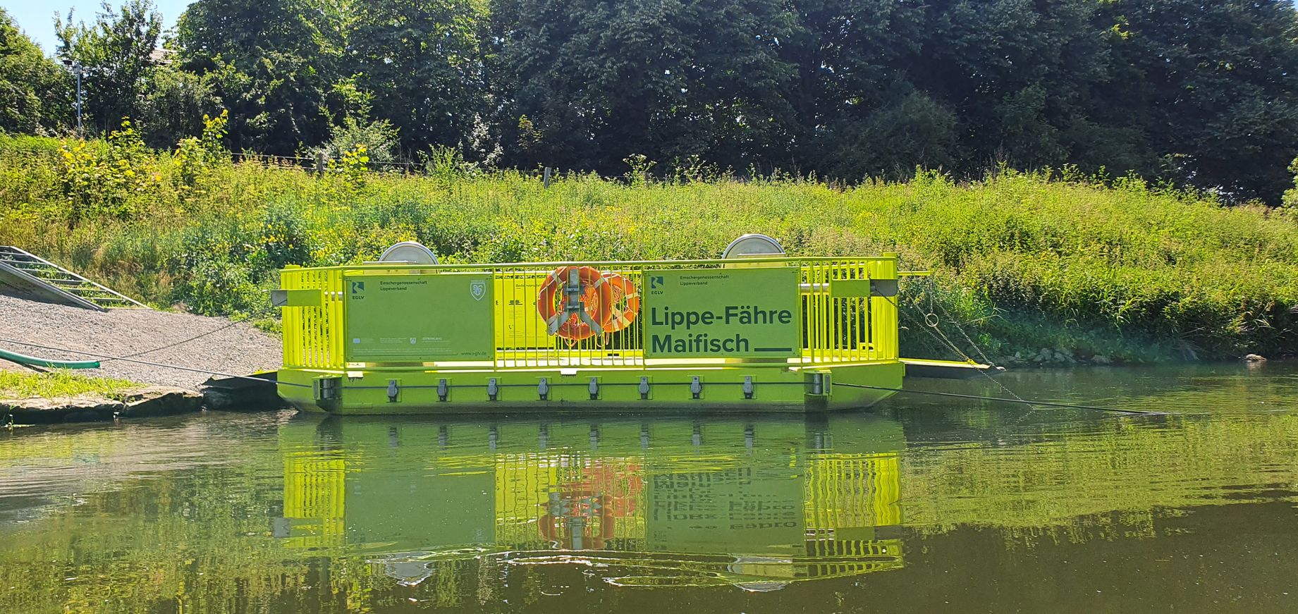 2015 haben der Lippeverband und die Stadt Haltern am See das Schiffchen namens “Maifisch” offiziell eingeweiht. Die Personenfähre besteht aus verzinktem und lackiertem Stahl, ist drei Meter breit und 6,50 Meter lang, bei ausgeklappten Rampen misst die Länge sogar 8,50 Meter. Durch das Betätigen einer Kurbel mit der Hand bewegt man sich dann von einem Ufer zum anderen und überquert so mit eigener Muskelkraft die Lippe. Dieser Vorgang ist auch für eine einzelne Person machbar aber durchaus etwas anstrengend. Eine Überfahrt dauert etwa 5 Minuten. Die Betriebszeit ist von April bis Ende Oktober. Das Foto wurde uns am 8. November 2023 von der Stadtagentur der Stadt Haltern am See zur Verfügung gestellt – herzlichen Dank!
