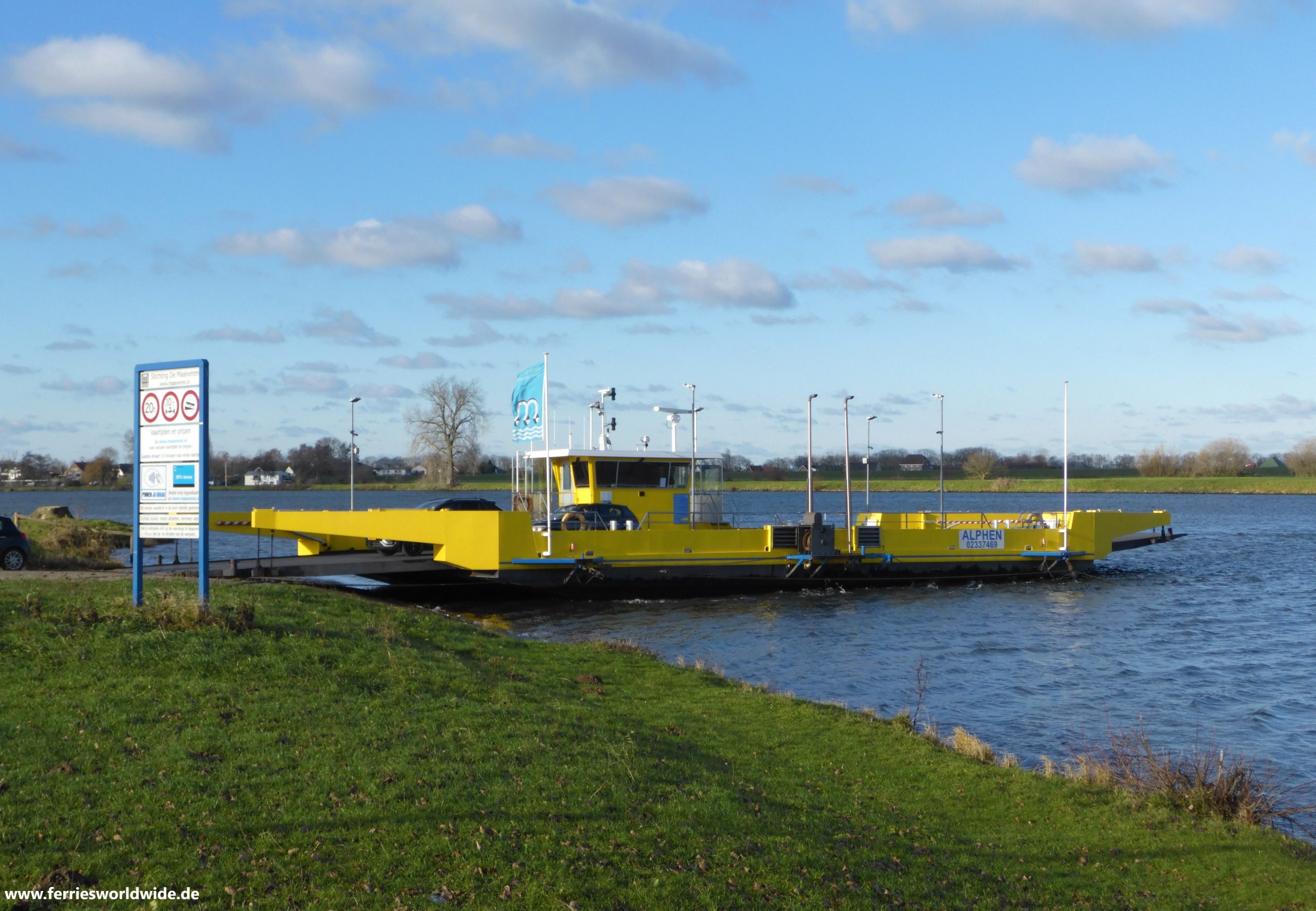 ) wurde 2017 unter der Baunummer 45/3551 auf der Scheepswerf Jac. Den Breejen in Hardinxveld-Giessendam gebaut und am 28.12 2017 auf der Verbindung Alphen – Oijen in Dienst gestellt. Sie ersetzte die 1962 gebaute Fähre “Savelkous”, die heute als “Spes Orientes” zwischen Huissen und Loo über den Nederrijn pendelt. Die Fähre ist 36,0 Meter lang, 12,95 Meter breit und hat einen maximalen Tiefgang von 1,15 Meter. Die “Alphen” ist für 100 Passagiere zugelassen und hat eine Tragfähigkeit von 60 Tonnen. Die Transportkapazität beträgt 12 PKW. Alle Fotos: Ulrich Repp, www.ferriesworldwide.de