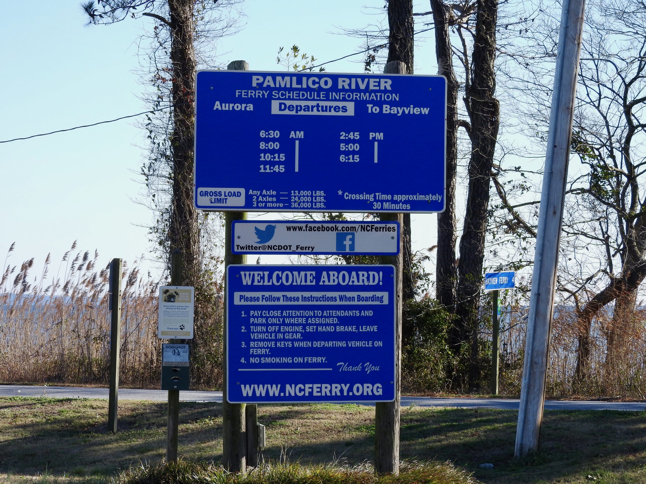 Zwischen Bayview am Nordufer und Aurora am Südufer verkehrt eine Autofähre des North Carolina Department of Transport. Eingesetzt wird die Doppelendfähre “Governor Daniel Russell”, die 7x täglich über den Pamlico River pendelt. Die erste Überfahrt ab Bayview beginnt um 5:45 Uhr, die letzte Fahrt um 17:40 Uhr. Die Fähre verkehrt alle 90 Minuten, zwischen 11:00 Uhr und 14:00 Uhr keine Abfahrt! Die Überfahrt dauert 30 Minuten.